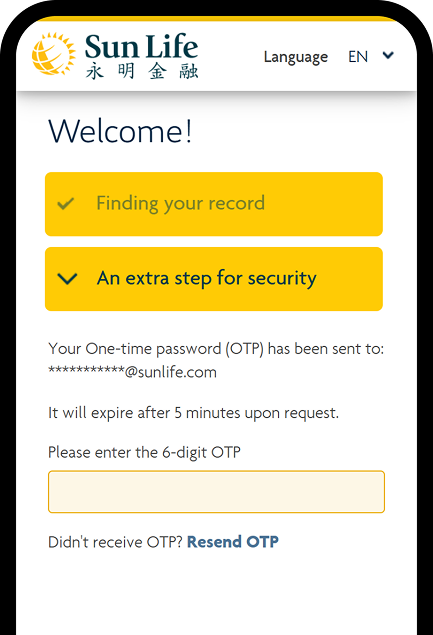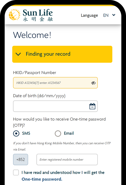 Enter your HKID / passport number and date of birth, then choose to receive One-time Password (OTP) via your registered mobile number or email address.